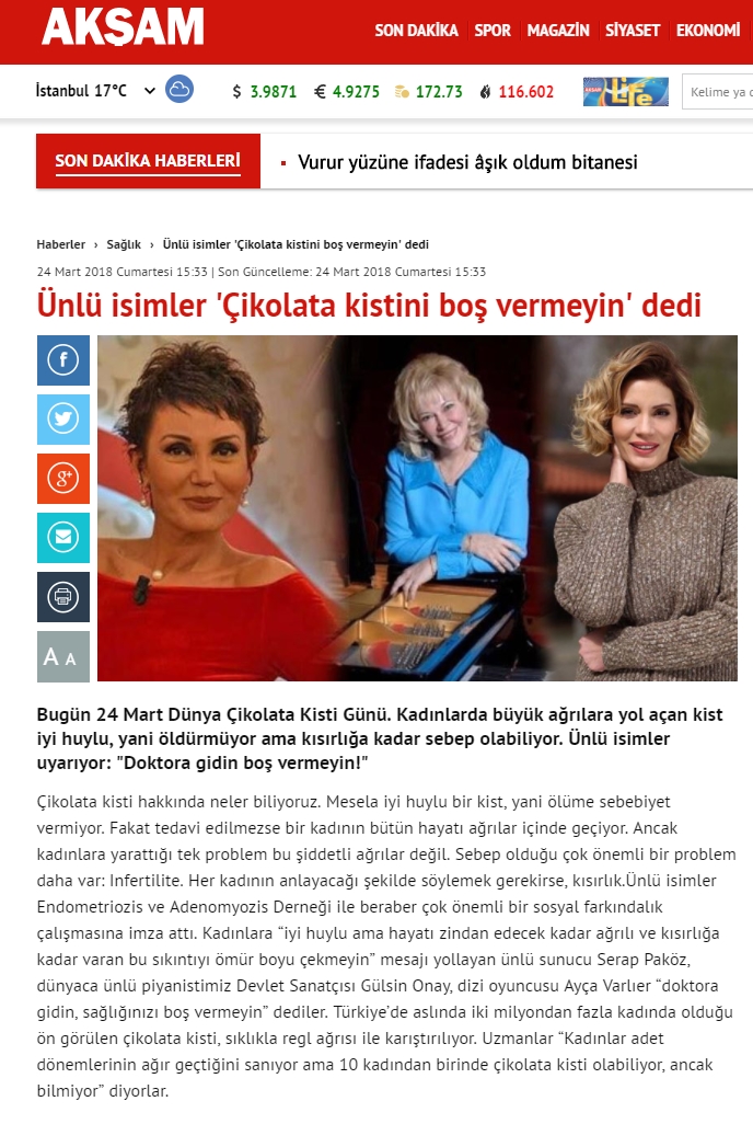 Çikolata kisti hakkında neler biliyoruz. Mesela iyi huylu bir kist, yani ölüme sebebiyet vermiyor. Fakat tedavi edilmezse bir kadının bütün hayatı ağrılar içinde geçiyor. Ancak kadınlara yarattığı tek problem bu şiddetli ağrılar değil. Sebep olduğu çok önemli bir problem daha var: Infertilite. Her kadının anlayacağı şekilde söylemek gerekirse, kısırlık.Ünlü isimler Endometriozis ve Adenomyozis Derneği ile beraber çok önemli bir sosyal farkındalık çalışmasına imza attı. Kadınlara “iyi huylu ama hayatı zindan edecek kadar ağrılı ve kısırlığa kadar varan bu sıkıntıyı ömür boyu çekmeyin” mesajı yollayan ünlü sunucu Serap Paköz, dünyaca ünlü piyanistimiz Devlet Sanatçısı Gülsin Onay, dizi oyuncusu Ayça Varlıer “doktora gidin, sağlığınızı boş vermeyin” dediler. Türkiye’de aslında iki milyondan fazla kadında olduğu ön görülen çikolata kisti, sıklıkla regl ağrısı ile karıştırılıyor. Uzmanlar “Kadınlar adet dönemlerinin ağır geçtiğini sanıyor ama 10 kadından birinde çikolata kisti olabiliyor, ancak bilmiyor” diyorlar.
