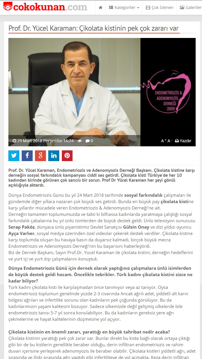 Prof. Dr. Yücel Karaman, Endometriozis ve Adenomyozis Derneği Başkanı. Çikolata kistine karşı derneğin sosyal farkındalık kampanyası ciddi ses getirdi. Çikolata kisti Türkiye'de her 10 kadından birinde görünen çok sancılı bir sorun. Prof Dr Yücel Karaman her şeyi gönül açıklığıyla aktardı.