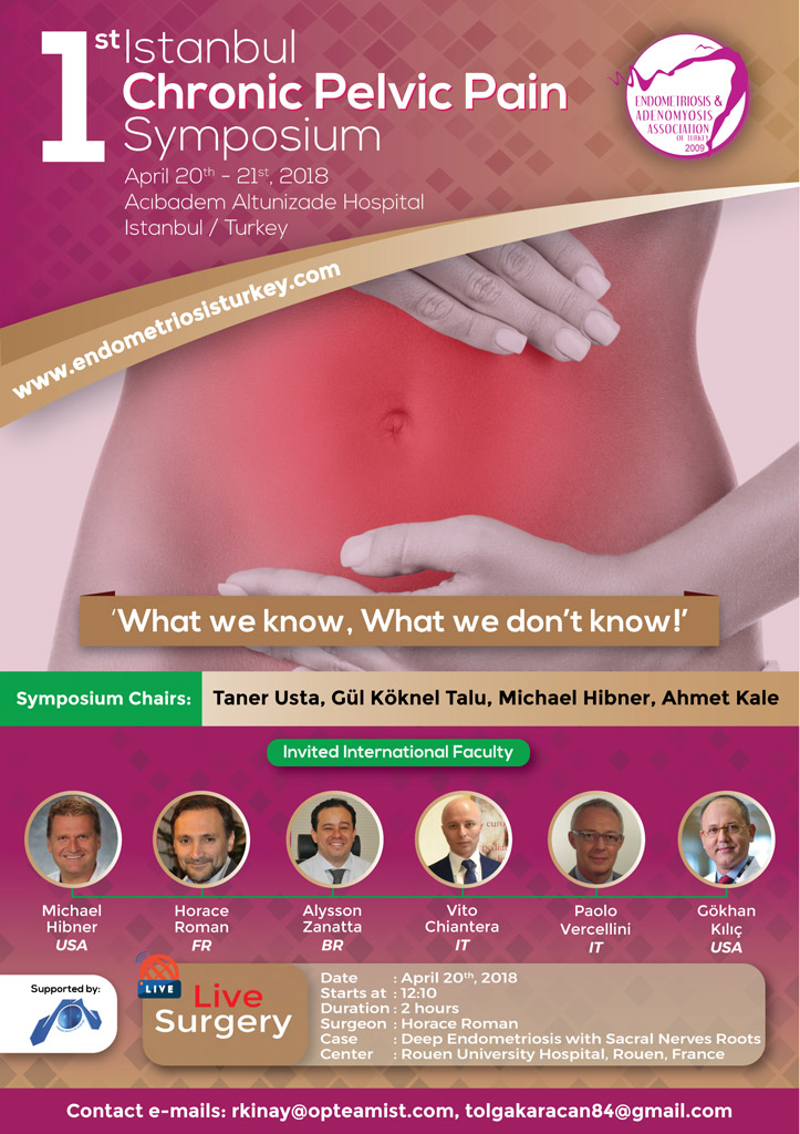 Endometriozis ve Adenomyozis Derneği olarak 20-21 Nisan 2018 tarihlerinde İstanbul'da ilk kez Kronik Pelvik Ağrı Sempozyumunu gerçekleştirdik. Bu toplantıda Pelvik ağrının sadece endometriozis, IBS veya interstisyel sistit vs.’den ibaret olamadığının altı özellikle çizilerek, şu ana kadar belki de ülkemizde hiç konuşulmamış birçok konu ilk defa konuşuldu ve bu konuda çok deneyimli olan gerek ulusal ve gerekse uluslararası hocalarımız tarafından tartışıldı. Toplantımız sırasında gene ilk defa Fransa’dan Canlı olarak Horace Roman Sakral Sinir Endometriozis’i vakasını gerçekleştirdi. Tüm Katılımcılarımıza ilgileri için teşekkür ediyoruz.