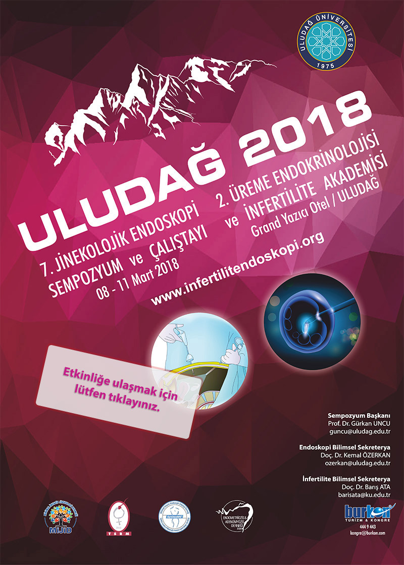Uludağ Üniversitesi Tıp Fakültesi Kadın Hastalıkları ve Doğum Anabilim Dalının düzenlediği 2. Üreme Endokrinolojisi ve İnfertilite Akademisi - 7. Jinekolojik Endoskopi Sempozyum ve Çalıştayında 9 Mart 2018 tarihinde Derneğimiz "Endometriozis-Ağrı/İnfertilite Yönetimi" konulu katılımın yoğun olduğu bir oturum gerçekleştirdi. Değerli Üyelerimizden Prof. Dr. Engin Oral, Prof. Dr. Gürkan Uncu, Prof. Dr. Ümit İnceboz, Doç. Dr. Ercan Baştu, Dr. Pınar Bahat, Dr. Işıl Kasapoğlu oturumda konuşmacı olarak yer aldılar. Ekibimizden Dr. Ezgi Darıcı ve Dr. Hale Göksever Çelik de destek olarak Uludağ 2018’de idiler. Katılımcılara ve emeği geçen herkese ilgisi için teşekkür ediyoruz.