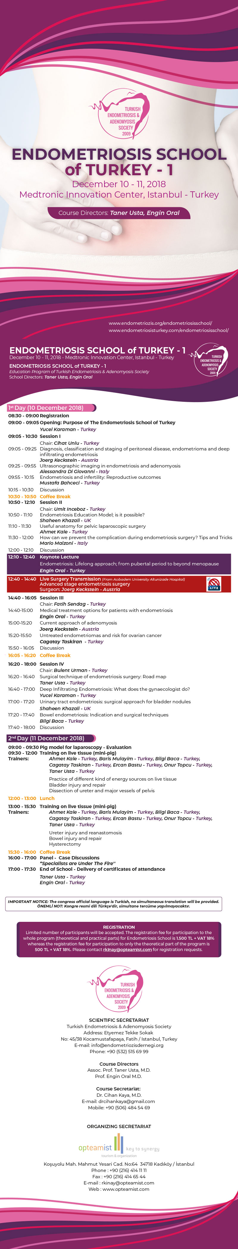 Bu yıl ilkini düzenlediğimiz Endometriozis Okulu (Endometriosis School of Turkey) 10-11 Aralık 2018 tarihinde İstanbul’da yüksek bir katılım ile gerçekleşti. Bilimsel içerik ve pratiğin yer aldığı 2 günlük organizasyonda, canlı cerrahi de yaptık. Avrupa’dan gelen endometriozis konusunda söz sahibi katılımcılarla birlikte genç doktorlara endometriozisi anlattık.