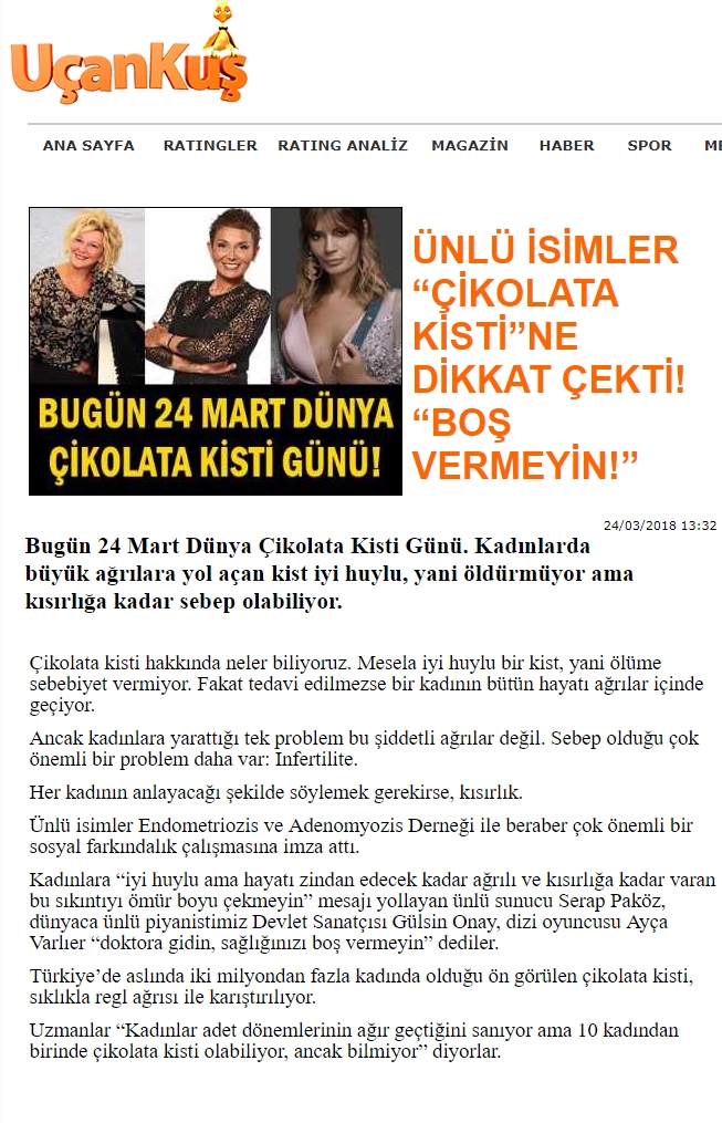 Famous reporter and tv programmer Serap Pakoz, famous state pianist Gulsin Onay and famous actress Ayca Varlier have supported our awareness campaigns on 24 March 2018 World Endometriosis Day.
