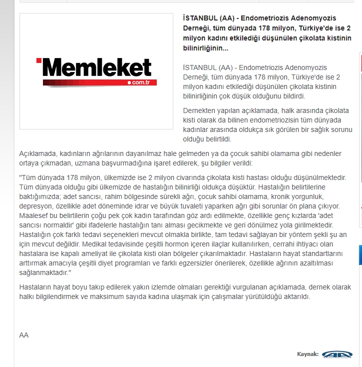 ISTANBUL (AA) - The Society of Endometriosis&Adenomyosis announced that awareness about chocolate cyst, which affects about 178 million women worldwide and about 2 million women in Turkey, is very low.