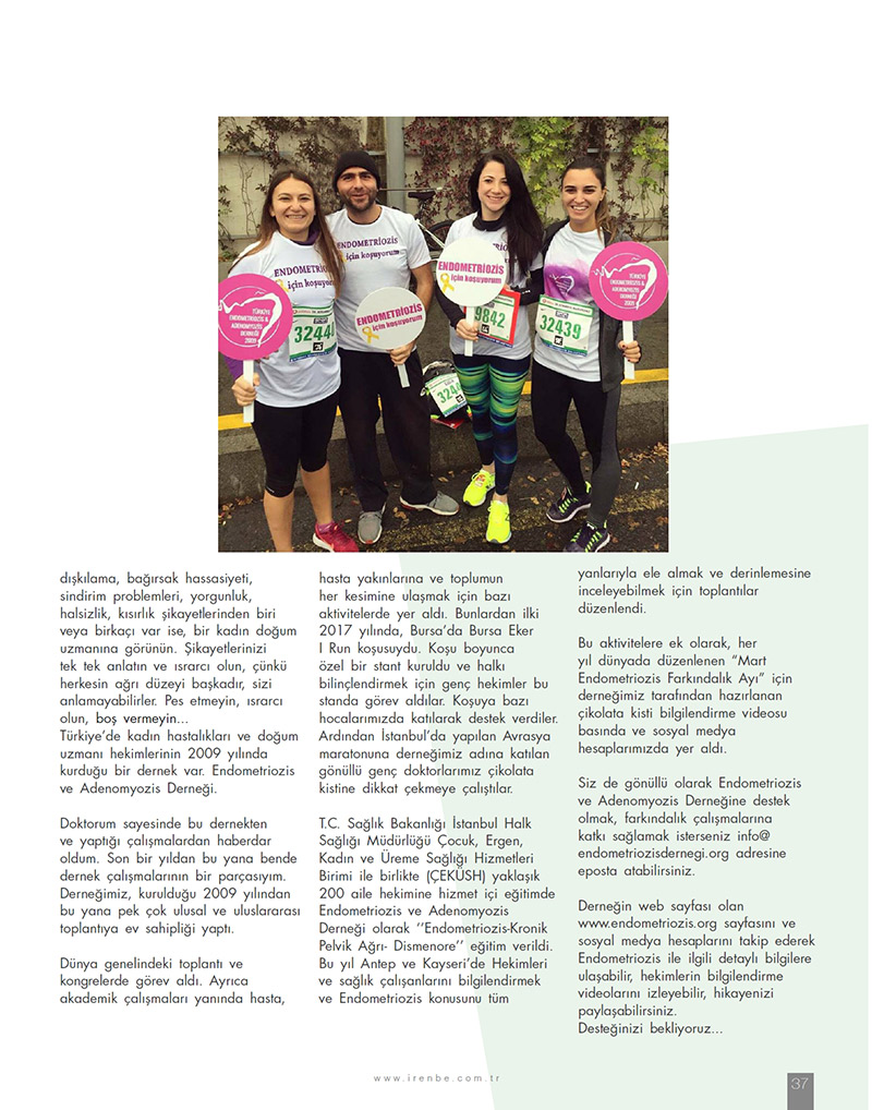 In Turkey there is an association founded by ob-gyn specialists in 2009. Turkish Endometriosis and Adenomyosis Society. I have been informed by my doctor about the presence of such an association and the activities it carries on. I’m a part of this association since last year. Since our association was founded in 2009, it hosted several national and international meetings. It has taken part in meetings and congresses worldwide. Besides academic studies, it has taken part in some activities to reach the patient, patient’s relatives and every part of the society. First activity organized by the association was “Bursa Eker I Run” run in 2017. A special stand was set up during the race and young physicians took part in this stand to raise public awareness. Some of our professors participated in the race and gave support. Then volunteer young physicians who attended the Eurasian marathon in Istanbul on behalf of our association tried to draw attention to the chocolate cyst. T. C. Ministry of Health Istanbul Public Health Directorate Child, Adolescence, Women and Reproductive Health Services Unit together with Endometriosis and Adenomyosis Association provided “Endometriosis -Chronic Pelvic Pain-Dysmenorrhea" training to approximately 200 family physicians. This year meetings were held in Antep and Kayseri to inform physicians and health workers, and to be able to handle and thoroughly examine endometriosis in all its aspects. In addition to these activities, the chocolate cyst information videos prepared by our association for the "march endometriosis awareness month" organized every year in the world took part in the press and our social media accounts.