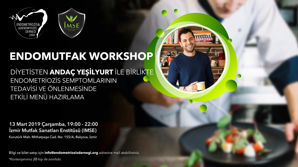 As the Endometriosis and Adenomyosis Association, we invite you to prepare “a daily painkiller menu” with recommended nutrients from the “endometriosis diet”, in order to shorten the period of painful times. On the 13th of March 2019 Wednesday, at 7 pm, at Izmir Mutfak Sanatları Enstitüsü, before the Workshop, we are going to be discussing the recommended nutrients, why they are chosen, and we are going to prepare a sample daily menu by Dietitian Andaç Yeşilyurt. We recommend you to book earlier, before the tickets are completely sold, since there is a limited place for this activity:⠀