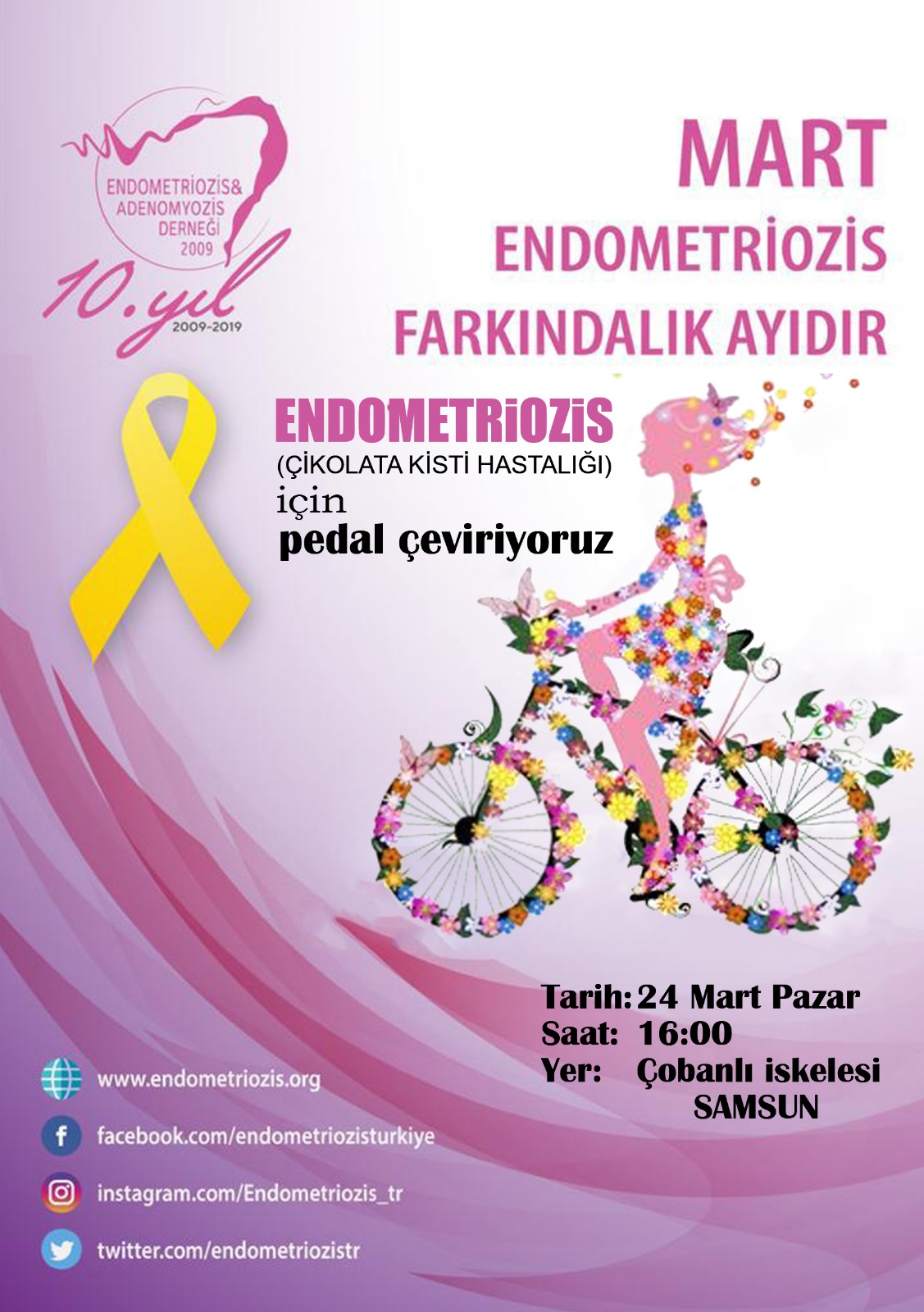 Cycling for Endometriosis March is endometriosis awareness month. We are cycling to raise awareness for endometriosis (chocolate cyst disease) Date: 03/24/2019 Time: 16:00 Place: Samsun Prev Next